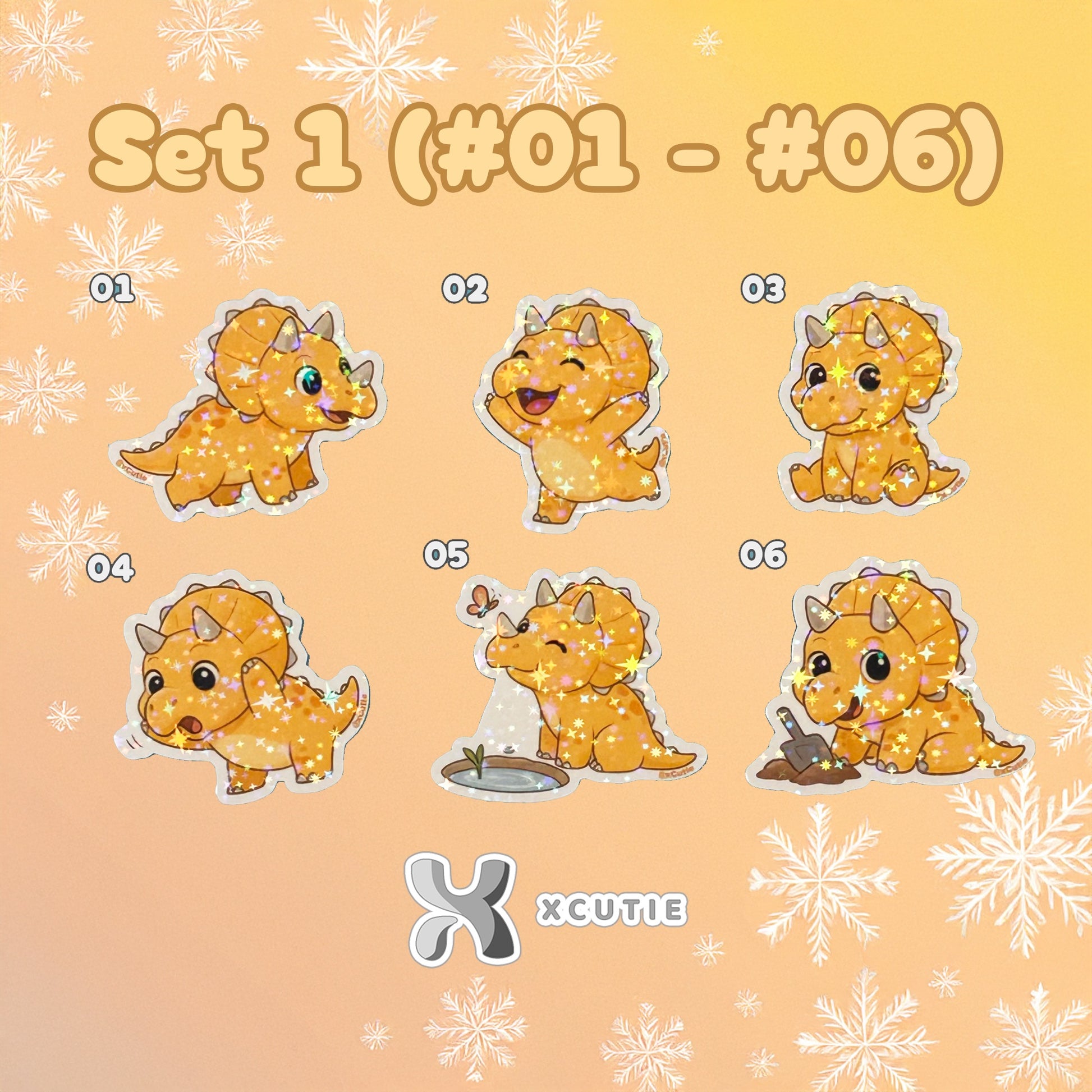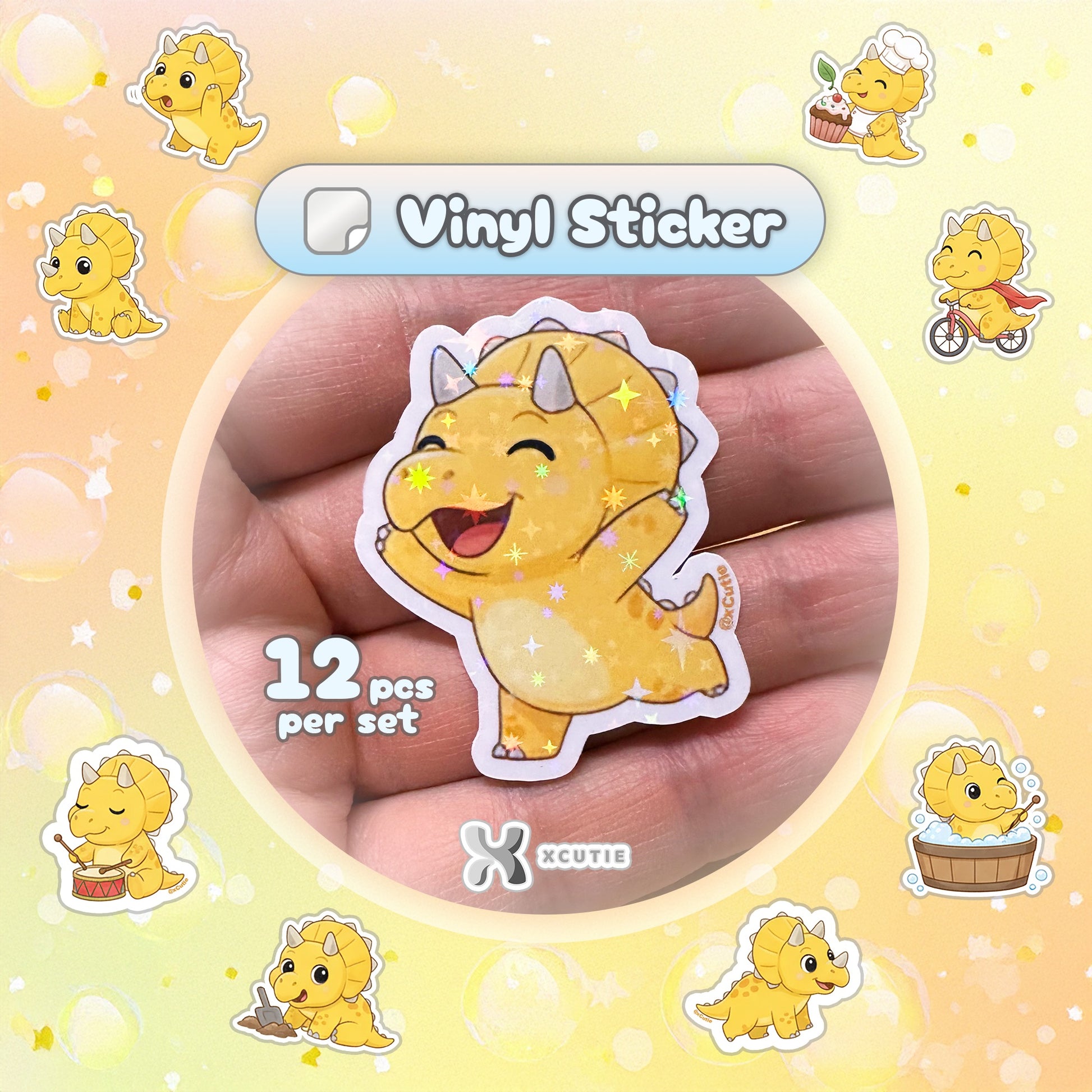 You'll receive a collection of 12 uniquely designed, high-quality, handmade stickers featuring our sweet triceratops character engaging in a variety of delightful activities:
